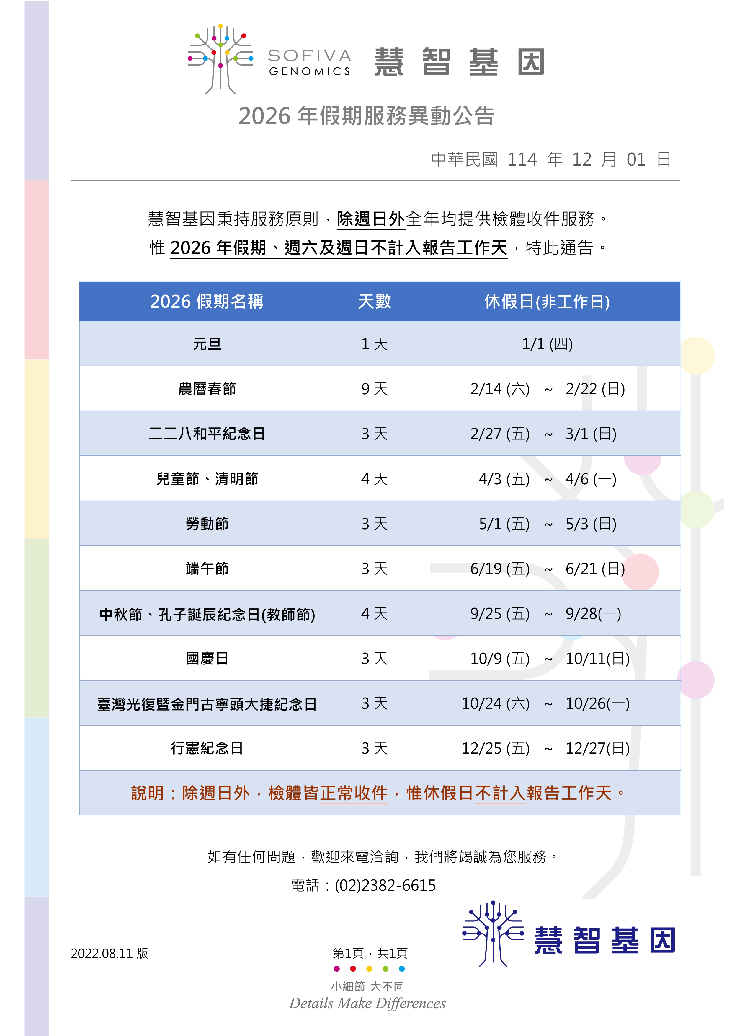 慧智基因秉持服務原則,除週日外全年均提供檢體收件服務。
