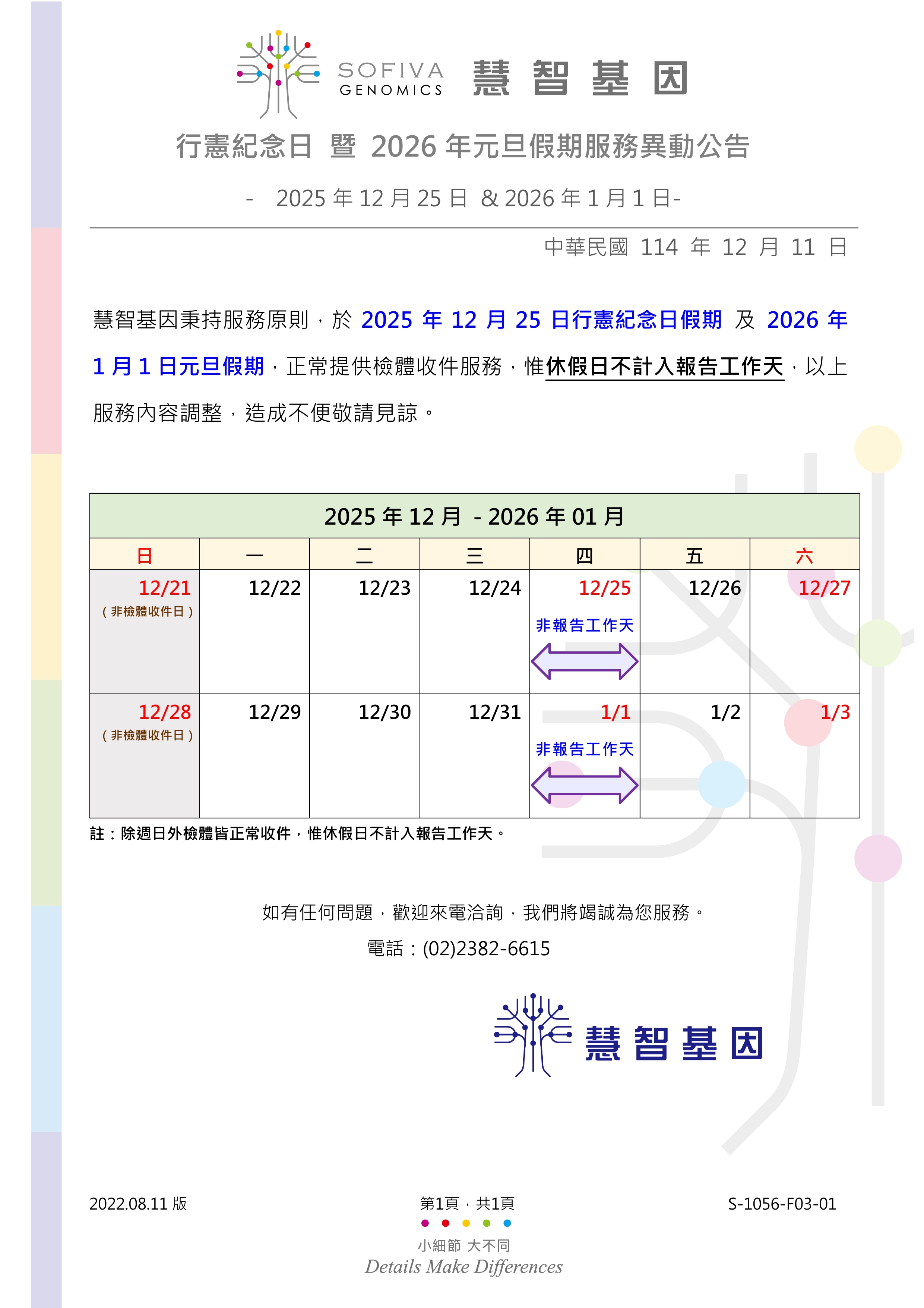 慧智基因秉持服務原則,於2025年12月25日行憲紀念日假期及2026年1月1日元旦假期正常提供檢體收件服務,惟休假日不計入報告工作天,以上服務內容調整,造成不便敬請見諒。