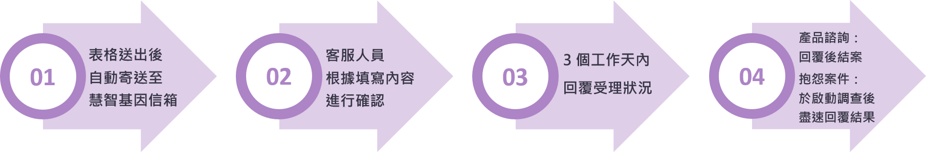客服人員接獲填寫內容後,將於3個工作天內(不含例假日及國定假日)回覆您。